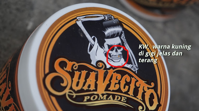 Suavecito pomade identik dengan logo atau maskotnya yaitu gambar tengkorak yang sedang menyisir rambutnya ya kan, kalo di lihat lebih jelas salah satu gigi bagian atas dai tengkorak ini berwarna kuning / coklat. Untuk yang asli warnanya terlihat sedikit samar samar, tapi untuk produk yang KW warnanya terlihat sangat jelas.